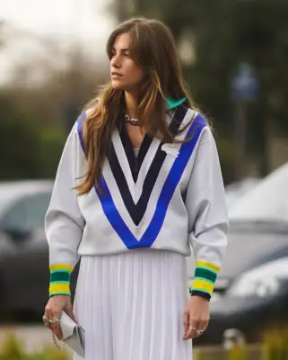 Geïnspireerd door een beroemde print van Jean Paul Gaultier, bestond de nauwsluitende rode loper-outfit van Ice Spice uit een set gestreepte mouwen in afwisselend zwart-witte golven. De monochrome strepen langs de buste en taille vormen een flatterend silhouet. Bij de taille veranderden de strepen plotseling van horizontaal naar verticaal terwijl ze zich langs haar benen uitstrekten tot aan de zoom halverwege haar dij. Terwijl Spice voor de camera poseerde, liet ze ook haar met kristallen versierde 'Baby Girl'-handtas van Amina Muaddi zien.